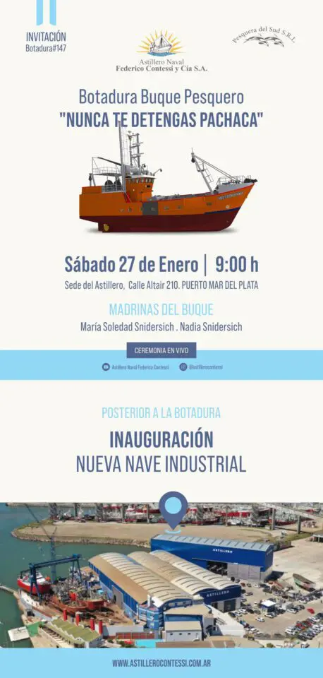 El sábado 27 de enero a las 9 hs, se llevara a cabo la botadura del B/P “ NUNCA TE DETENGAS PACHACA ” en el Astillero Naval Federico Contessi y Cía. S.A El buque un pesquero construido para la firma Pesquera del Sur S.R.L. se convertirá en la botadura 147 del Astillero constructor.