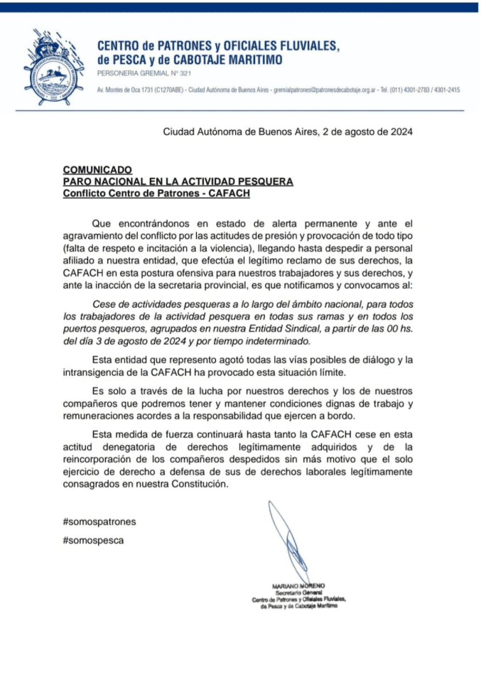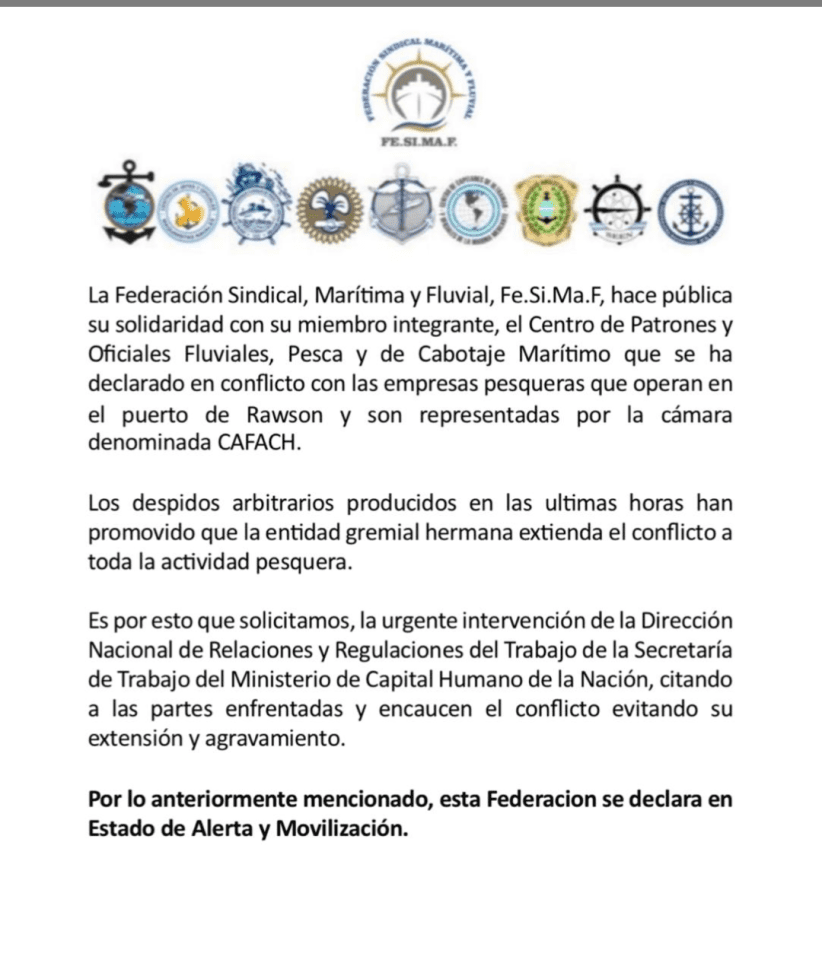 El Centro de Patrones y Oficiales Fluviales, de Pesca y de Cabotaje Marítimo decretó un paro nacional en la pesca por una veintena de despidos en la Flota Amarilla de Rawson de patrones y oficiales en el marco del conflicto con la CaFACh.