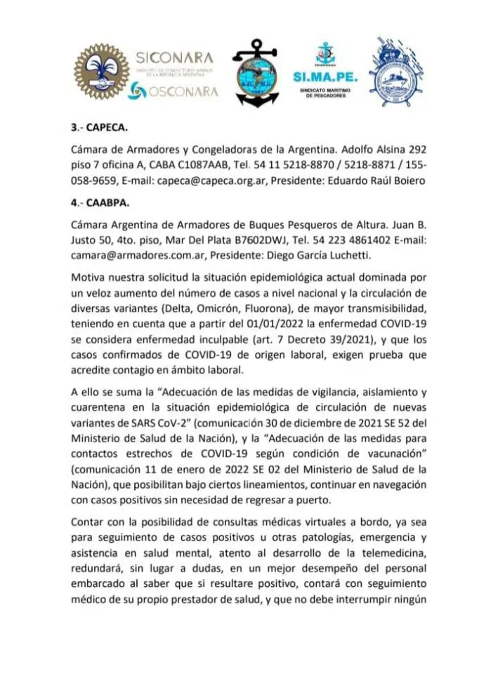 En frente a una nueva cadena de contagios en los buques pesqueros los gremios marítimos presentaron una nota a los fines de coordinar una audiencia con las diferentes cámaras empresariales para tratar un nuevo protocolo COVID´19
