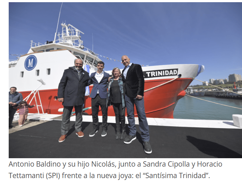 Bajo un cielo despejado y con un ambiente festivo, este sábado por la mañana se llevó a cabo en la Escollera Norte, junto a la Base Naval de Mar del Plata, la presentación oficial del “Santísima Trinidad”. Se trata de una embarcación pesquera multipropósito fabricada íntegramente en los talleres de SPI Astilleros, fruto de la alianza entre la firma Maronti S.A. y la familia Baldino.