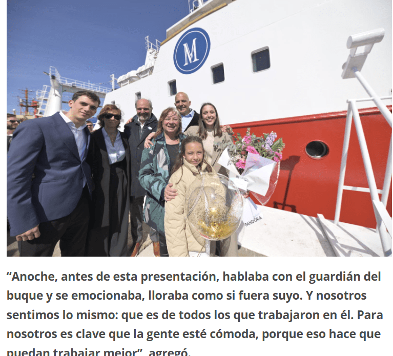 “Este barco lo vimos nacer desde cero. Representa un esfuerzo compartido entre profesionales, proveedores, trabajadores. Todos aportaron para hacerlo realidad. Anoche hablábamos con el guardián del buque, y se emocionaba como si fuera suyo. Así lo sentimos también nosotros”, relató.