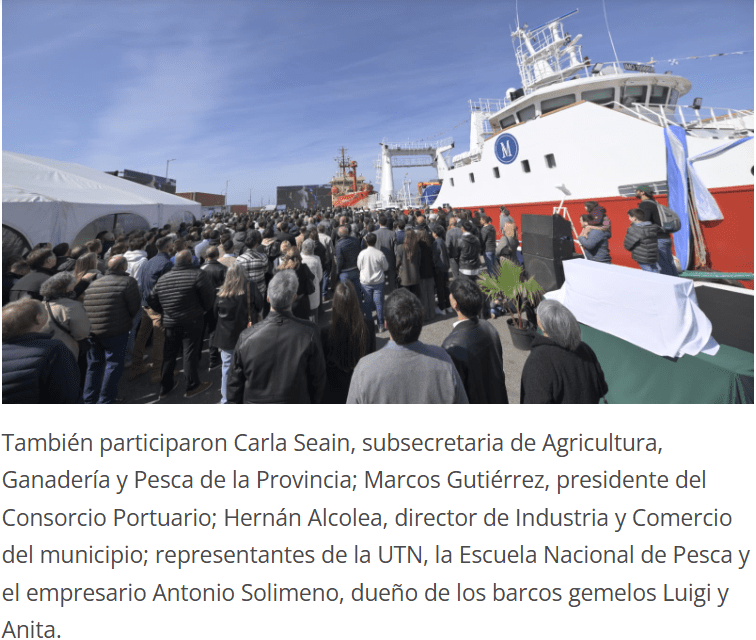 El evento reunió a representantes del sector público y privado: autoridades nacionales, provinciales y municipales; integrantes de la Armada Argentina, Prefectura Naval, la Escuela Nacional de Pesca, la Universidad Tecnológica Nacional, así como trabajadores, proveedores, familiares y empresarios del ámbito marítimo.