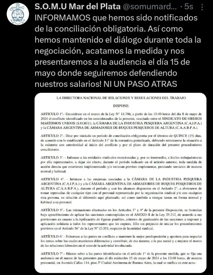Fue dictada la conciliación obligatoria para el conflicto paritario que llevan adelante SOMU y las cámaras armadoras CAIPA / CAABPA .