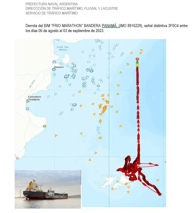En la víspera, el buque de carga congelada (reefer) “FRIO MARATHON” (IMO 8916229), de bandera panameña, arribó a la rada del Puerto de Mar del Plata procedente de las Islas Malvinas y por medio del personal de la Prefectura Mar del Plata fue notificado oficialmente que se le iniciaron actuaciones administrativas por haber operado en las Islas Malvinas sin la debida autorización del Estado argentino, infringiendo la normativa nacional, lo que demuestra el constante esfuerzo de esta Autoridad Marítima para hacer cumplir la reglamentación vigente y ejercer la soberanía de nuestras Islas.
