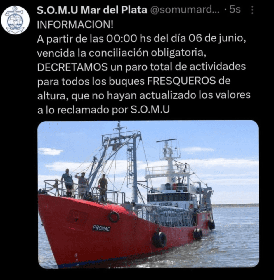 SOMU Mar del Plata decreta un paro total de actividades para la flota fresquera de altura luego de haberse cumplido los plazos en tiempo y forma de conciliación obligatoria en el cual las partes tenían tiempo para arribar a un acuerdo donde claramente no se llegó a tal fin.